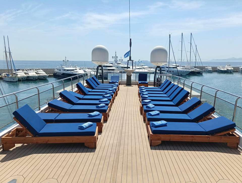 Le capitaine vous invite à bord du Variety Voyager, un agréable yacht à moteur de 68 mètres de long sur 11 mètres de large, équipé de stabilisateurs. Sur le pont principal, vous trouverez un vaste lounge idéal pour vous détendre dans de confortables canapés. Le restaurant se situe à l'arrière du pont supérieur. Le sun deck (ou pont supérieur) offre une vue à 360 degrés sur la mer et les sublimes îles grecques. C'est l'endroit parfait pour s'allonger sur un transat et profiter du soleil. Pour encore plus de confort, le navire dispose également d'un sky deck vous permettant de parfaire votre bronzage tout au long de la croisière. Et si vous souhaitez vous faire chouchouter un peu, rendez-vous dans le SPA, pour des soins et massages.