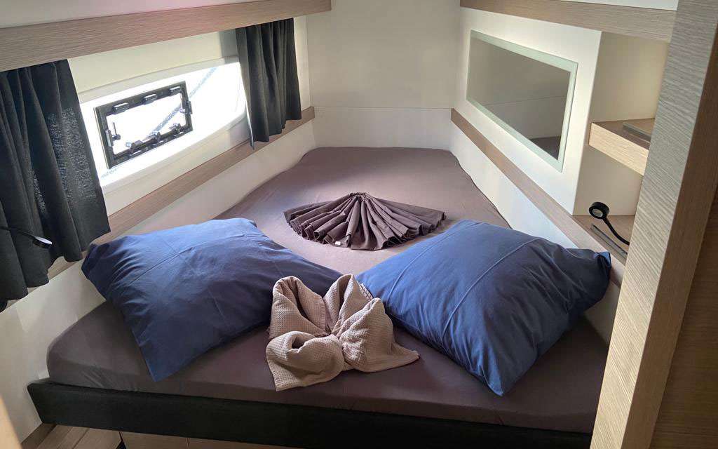 Ce catamaran dispose de 4 cabines doubles à partager (genrées), équipées d'un lit double, de rangements (il est préférable de voyager avec des bagages souples), d'un ventilateur.